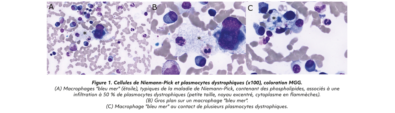 Chez les patients suivi pour une maladie de Niemann-Pick de type B, un premier cas de myélome IgG lambda symptomatique a été rapporté par le Dr E. Portier dans la même équipe d'hématologie qui a décrit ce cas (7). Ce patient avait été initialement étiqueté maladie de Gaucher, il présentait les mêmes atteintes d'organes (hépatosplénomégalie et pulmonaire) et une infiltration plasmocytaire de 41 % associé aux macrophages « bleu de mer » (cellule non retrouvée dans la maladie de Gaucher) avec une issue favorable pour le moment. Notre patiente constitue ainsi le deuxième cas documenté en France, et il existe au moins un troisième cas documenté aux États-Unis (données personnelles). Les maladies de surcharge lysosomale, notamment Gaucher et Niemann-Pick, exposent à un risque accru de gammapathies monoclonales. Dans la maladie de Gaucher type 1, la prévalence de la phase pré-myélome qu'est la gammapathie monoclonale de signification indéterminée (MGUS en anglais) atteint 32 %, et le risque de myélome est particulièrement élevé par rapport à la population générale (RRx25-51) (8). Dans une série française de suivi des patients avec Niemann-Pick de type B menée par le Dr Lidove, 6 patients sur 28 présentaient une hypergammaglobulinémie dont 5 MGUS mais aucun cas de myélome n'avait été décrit à l'époque (3).