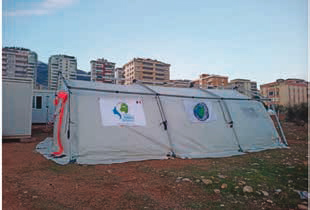 Hôpital Femmes-Mères-Enfants Necip Fazil Sehir Hastanesi à Kahramanmaras. Dès le 13 février, les logisticiens de Pompiers Solidaires installent sur le parking de l'hôpital la tente Poste Médical Avancé qui servira de base de vie. Cette tente sera chauffée, condition sine qua non à la pérennisation de ces missions en Turquie tant les nuits ont été difficiles (les températures avoisinent les -15°C).