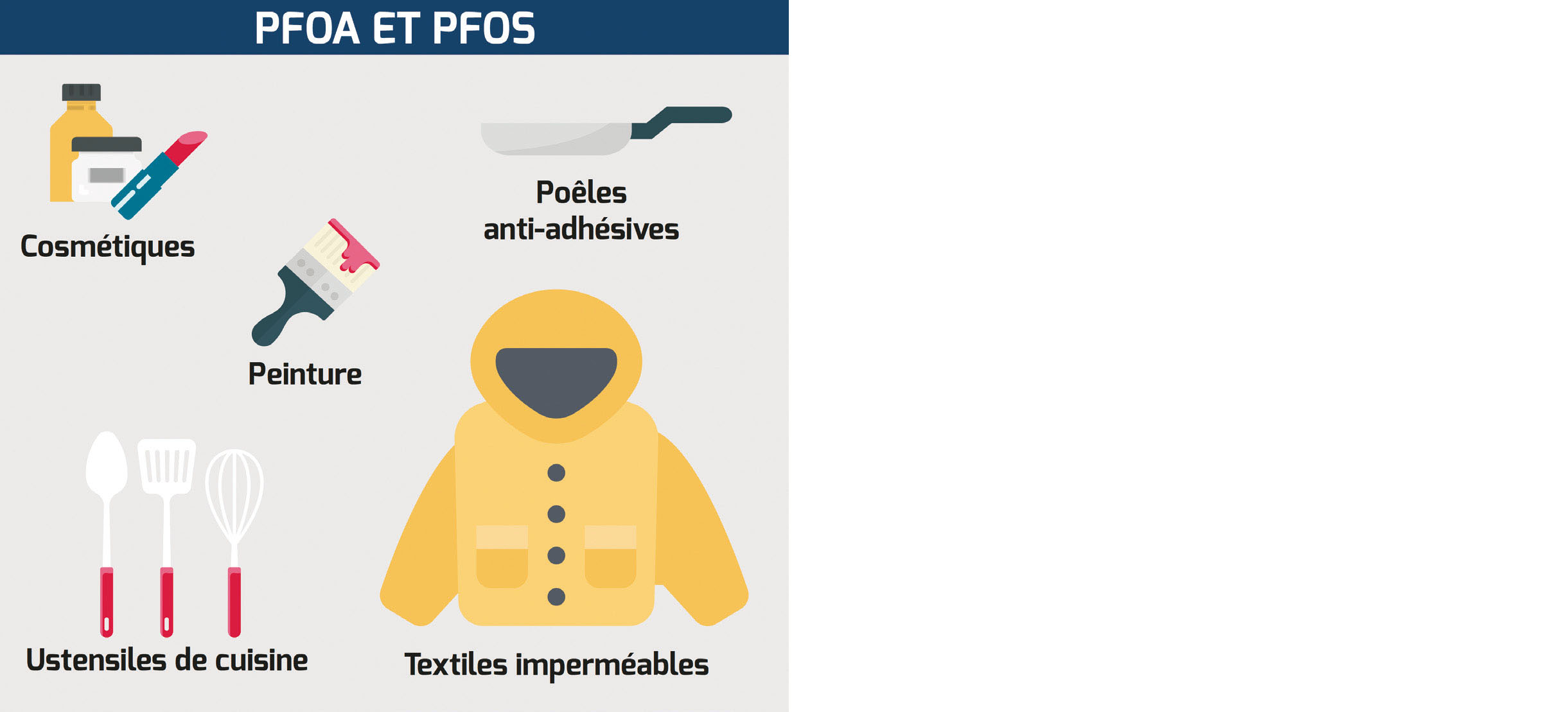 D'abord, expliquons d'où ils proviennent. Les PFAS sont une large famille de composés chimiques à laquelle appartiennent notamment les PFOA et les PFOS, ils sont très utilisés dans l'industrie depuis les années 40. Leur essor a été permis par leur grande versatilité et donc grande utilité dans divers domaines. Ils sont notamment utilisés pour leurs vertus imperméabilisantes, anti-adhésives, de résistance à la chaleur et leur durabilité. C'est donc logiquement qu'on les retrouve dans de nombreux éléments de notre quotidien : vêtements de pluie, mousse anti-incendie, produits de soins personnels, pesticides, emballage alimentaire, poêle, etc.