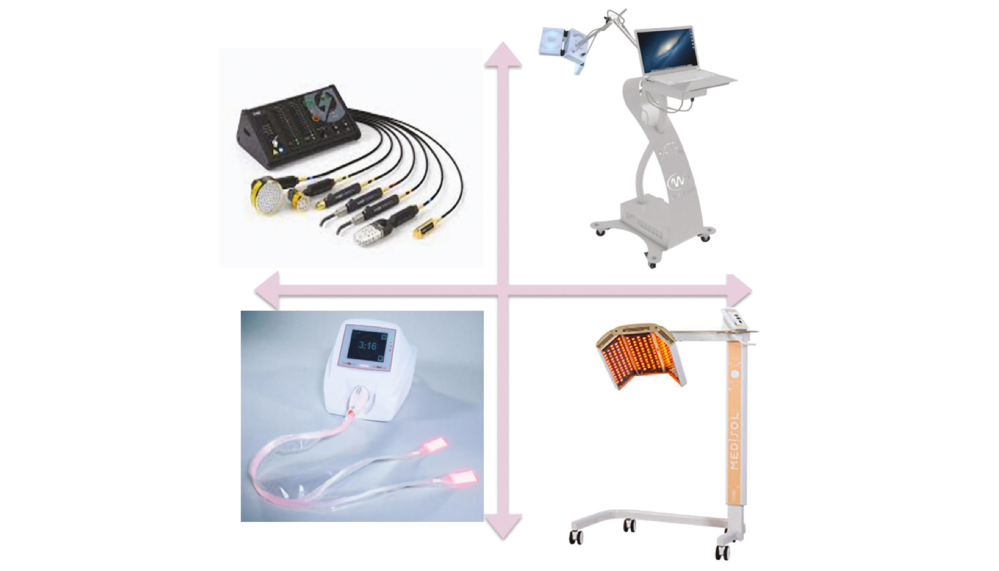 Dans les dernières années, plusieurs autres dispositifs ont vu le jour. Pour la PBM au contact, il existe un tissu fait de fibre optique qui peut se placer directement au contact de la peau ou de la muqueuse pour délivrer la lumière simplifiant ainsi le traitement (4). Son inconvénient vient de l'utilisation de consommables augmentant le coût global. Enfin, des lampes LED utilisées en médecine esthétique ont été ré-adaptées pour délivrer une PBM à proximité de la cible, sans forcément être au contact de la peau ou de la muqueuse. Ces lampes ont l'avantage de traiter de larges zones facilement, d'être peu onéreuses, mais rendent plus difficile le traitement de zones de muqueuses plus profondes (Figure 2).