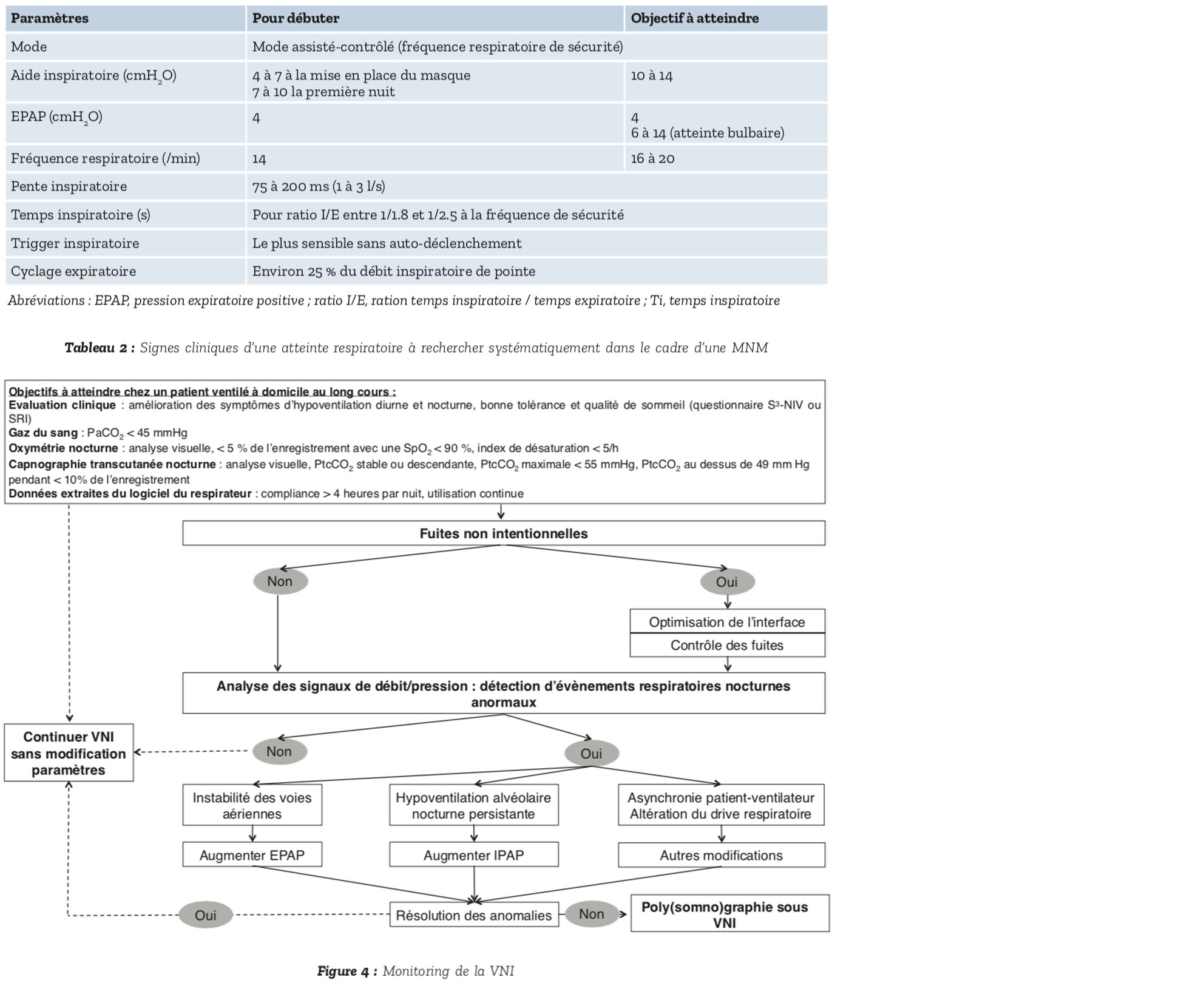 Bien qu'il n'y ait pas de preuve formelle qu'il soit plus efficace sur les symptômes, la capnie ou la survie que le mode volumétrique (23), historiquement utilisé pour la ventilation des patients neuromusculaires, il est recommandé d'initier la ventilation en mode barométrique car il assure mieux la compensation des fuites comme la synchronie patient-ventilateur. Il permet également un meilleur confort et une adaptation plus rapide du patient à la ventilation. Un mode assisté contrôlé avec une fréquence minimale de sécurité doit être utilisé. Les para- mètres initiaux recommandés par le groupe de travail GAVO2 de la Société de Pneumologie de Langue Française figurent dans le Tableau 2. Ils sont accessibles dans leur intégralité sur internet (https:/splf.fr/documents-et-liens-gavo2/).