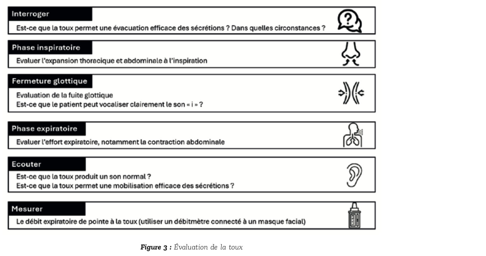 L'encombrement est favorisé par une atteinte de la toux liée à une fai- blesse des muscles inspiratoires et expiratoires associée à une dysfonction glottique. D'éventuels troubles de la déglutition peuvent aggraver l'encombrement. L'impact pronos- tique d'une faiblesse de la toux étant largement établi, son efficacité doit être régulièrement évaluée, en utilisant différentes composantes illustrées par la Figure 3, d'après (17).