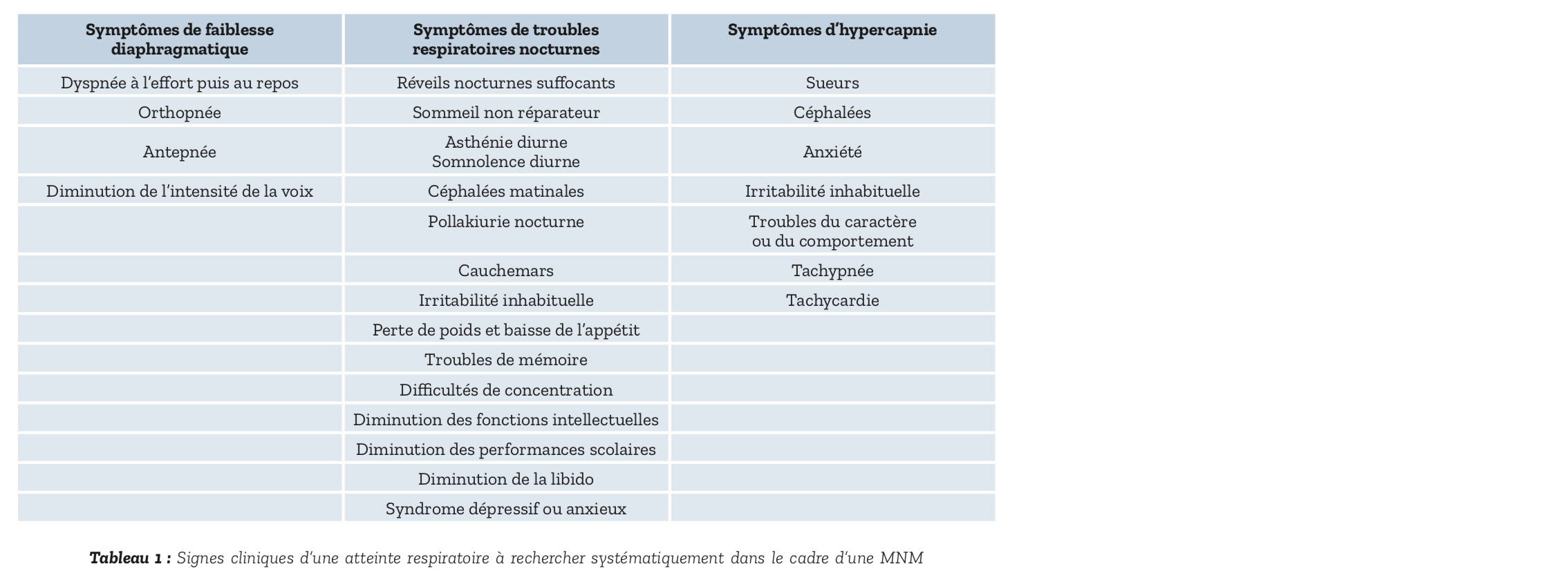 L'aggravation progressive de la fai- blesse diaphragmatique conduit à un syndrome restrictif sévère à l'origine d'une hypoventilation alvéolaire nocturne, plus particulièrement en som- meil paradoxal (2), puis diurne. Son diagnostic nécessite, de façon régulière et rigoureuse, une évaluation clinique, une exploration fonctionnelle et un dépistage des anomalies respiratoires nocturnes.