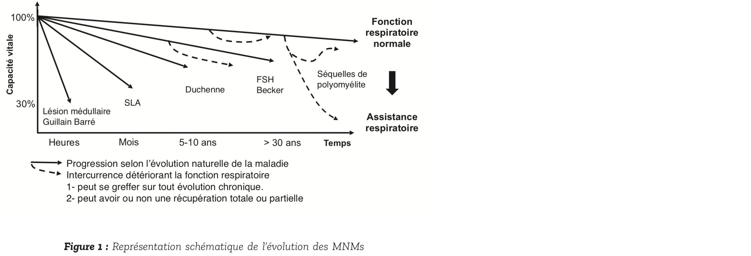 Elles constituent un groupe hétéro- gène de maladies caractérisées par des atteintes de l'unité motrice à différents niveaux (le nerf, la jonc- tion neuromusculaire ou le muscle) se manifestant par une perte de force par défaut de commande du muscle ou par destruction du mus- cle qui s'atrophie. Elles se distinguent selon leur origine, l'âge de survenue, les symptômes et les complications associées. Elles ont souvent en commun leur retentissement respiratoire. Celle-ci peut se manifester de façon aiguë sous la forme d'une détresse respiratoire, à l'occasion d'un événement intercurrent déclenché par un épisode infectieux, une embolie pulmonaire, la prise d'un traitement dépresseur respiratoire ou encore une intervention chirurgicale. Surtout, les MNM entraînent, dans un délai très variable de quelques heures à plusieurs dizaines d'années, une insuffisance respiratoire chronique progressive (Figure 1). Toute la complexité de la prise en charge respiratoire est le caractère insidieux de l'atteinte respiratoire qui risque d'être sous-estimée alors qu'elle reste la principale cause de morbi-mortalité des patients neuromusculaires. On verra quelles modalités sont utiles pour dépister précocement et prendre en charge efficacement l'atteinte respiratoire chez les patients neuromusculaires.