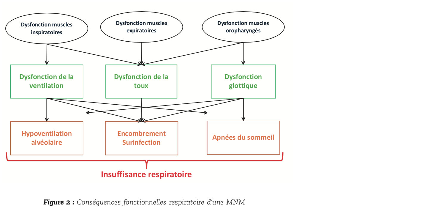 L'atteinte respiratoire résulte d'une diminution progressive des propriétés contractiles des muscles inspiratoires mais aussi expiratoires et des muscles oropharyngés (Figure 2, d'après (1)).