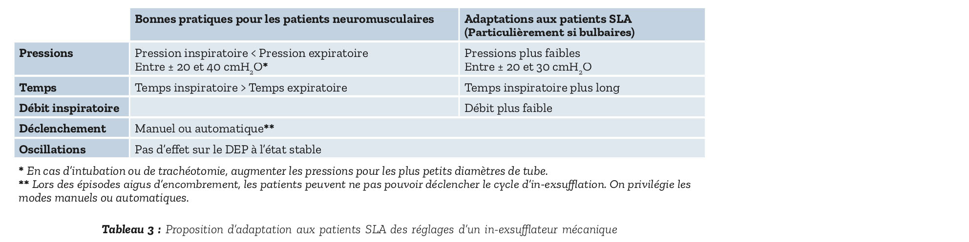 Avec un DEP à la toux en dessous de 270 l/min, une aide mécanique à la toux doit être mise en place car les techniques manuelles kinésithérapiques classiques peuvent engendrer une fatigue et se révéler inefficaces. Après une première phase de drainage des sécrétions périphériques, différentes techniques instrumentales existent qui compensent soit la phase inspiratoire soit la phase expiratoire d'élimination des sécrétions des voies aériennes proximales. Elles nécessitent toutes une grande expertise du personnel soignant ainsi qu'une formation des patients et des aidants. Une mise en place avant les périodes aiguës d'encombrement est donc conseillée. Elles pourront ainsi être utilisées à visée curative lorsque le débit expiratoire de pointe chute en dessous de 160 l/min. Chez les patients neuromusculaires les plus faibles, l'utilisation d'inexsufflateurs mécaniques doit être privilégiée (31). Le Tableau 3 propose des modalités pratiques pour l'initiation d'un in-exsufflateur mécanique.
