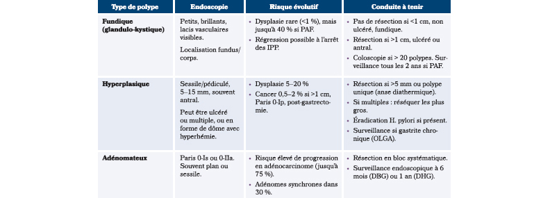 Durant notre internat, un des premiers gestes que nous apprenons est de réaliser une gastroscopie. Les polypes gastriques représentent entre 1 à 6 % des gastroscopies et il existe plusieurs types de polypes impliquant des conduites à tenir pouvant être différentes.