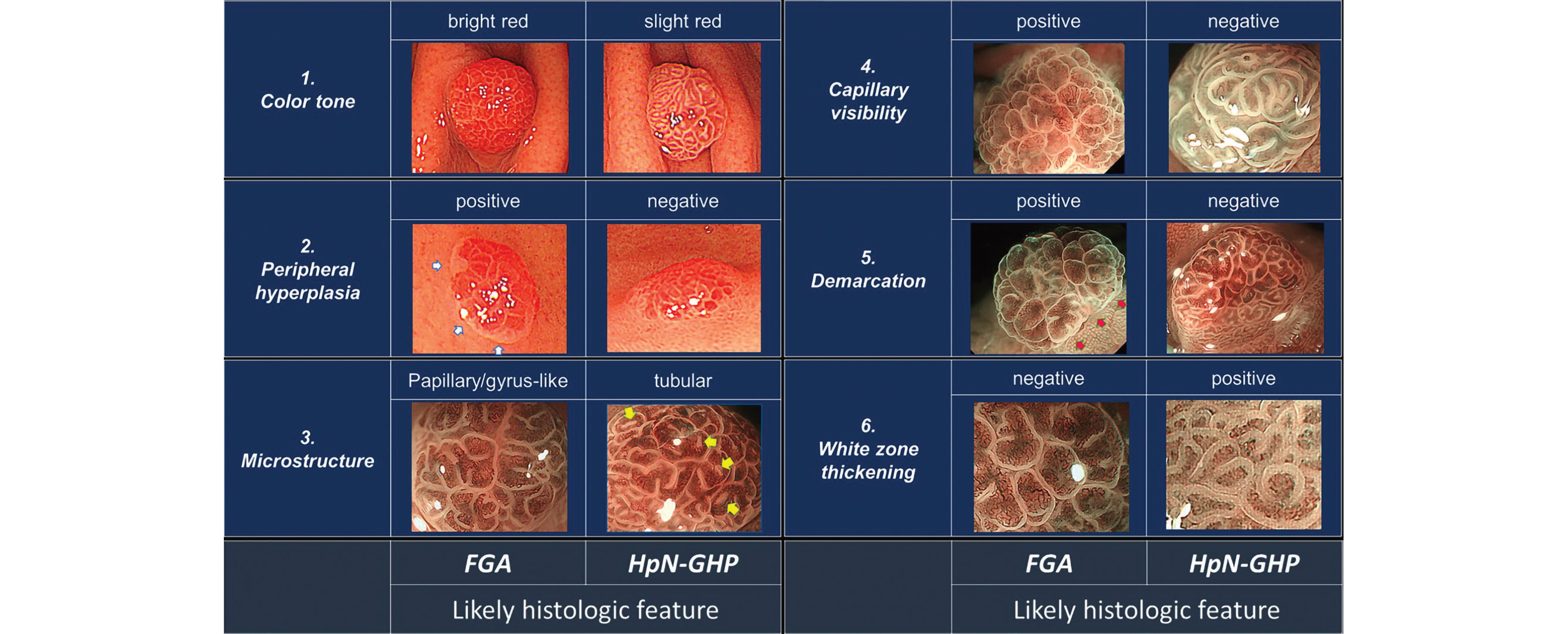 Figure 7 · L'adénome gastrique de type fovéolaire, en comparaison avec le polype hyperplasique HpN-GHP, est rouge vif avec une hyperplasie des glandes à sa périphérie, a une microstructure plutôt papillaire avec des circonvolutions (en opposition avec la présence de tubules), des micro-vaisseaux visibles en chromo-endoscopie, une démarcation basale nette et l'absence de l'épaississement blanchâtre au niveau des circonvolutions. On considère que la présence de quatre critères sur six permet de le classer comme un adénome gastrique à type fovéolaire, et donc à la résection en bloc systématique