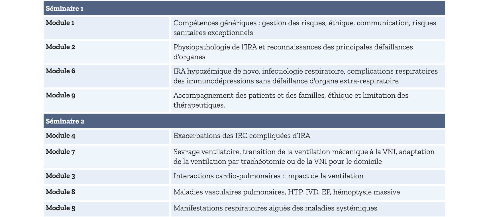 L'enseignement repose sur deux séminaires de quatre demi-journées chacun. Le premier est organisé les années paires, le second les années impaires, permettant ainsi à chaque interne inscrit dans l'option de bénéficier de l'ensemble du programme sur son cycle de formation. Ces séminaires couvrent un large spectre de thématiques essentielles : compréhension des défaillances d'organes, approche multidisciplinaire avec des spécialistes de médecine intensive- réanimation, prise en charge des urgences respiratoires, gestion de la défaillance ventriculaire droite, maîtrise des techniques de ventilation… et une réfl exion structurée sur les dimensions éthiques propres aux situations d'insuffisance respiratoire aiguë et de soins critiques, incluant les décisions d'escalade ou de limitation thérapeutique, l'accompagnement des familles et les enjeux de communication. Le contenu détaillé de cette formation est présenté dans le tableau 1.