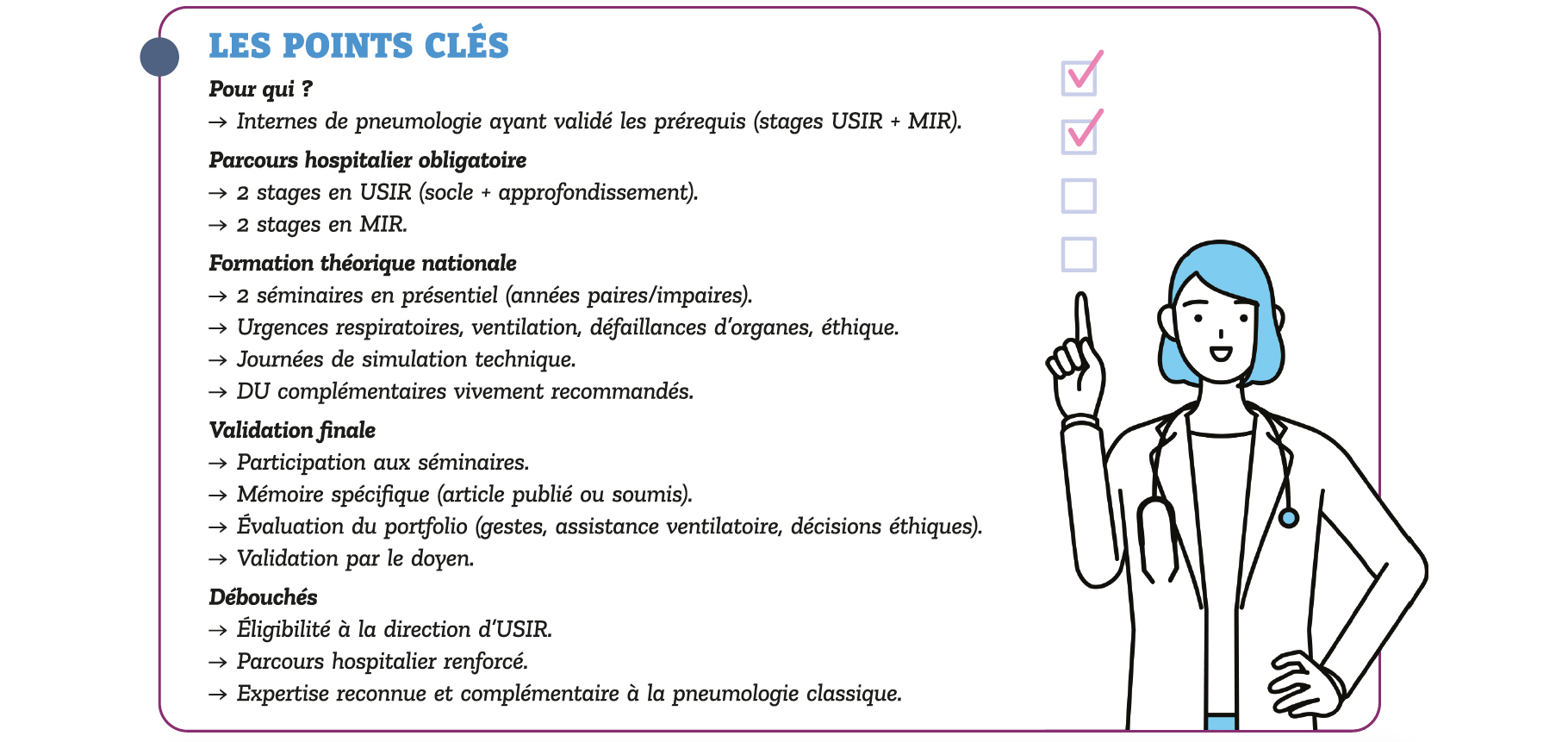 Dans la nouvelle organisation des soins critiques, il est désormais précisé que les USIR doivent être dirigées par un pneumologue ayant validé l'option USIR. L'obtention de cette option ouvre donc des perspectives professionnelles privilégiées : elle vous permet de vous inscrire pleinement dans la structuration actuelle des soins critiques respiratoires et de construire une carrière hospitalière au sein de ces unités spécialisées.