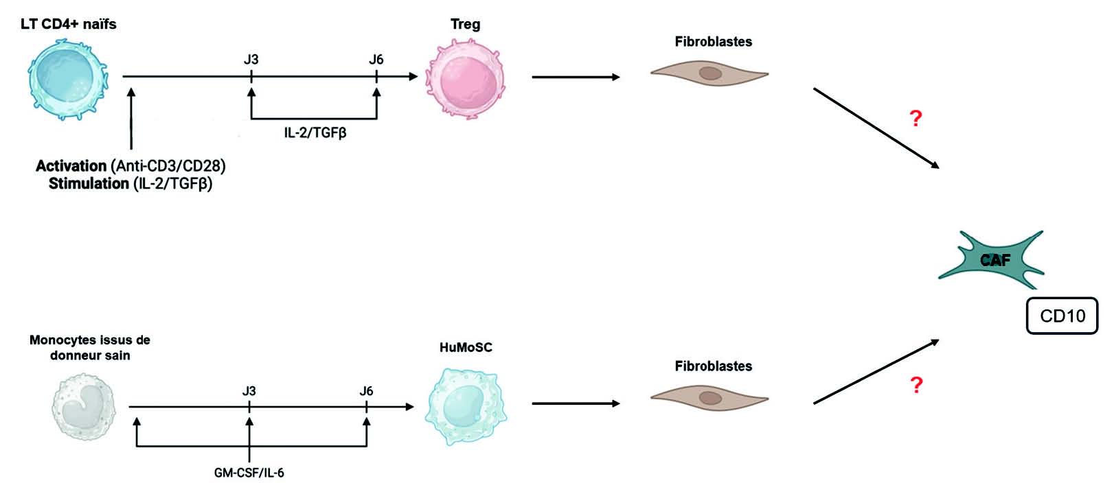 Figure 3 : Représentation schématique de la génération de Treg et de HuMoSC in vitro et mise en coculture avec des fibroblastes. Analyse de la polarisation de ces cellules en CAF sur un marqueur de différenciation de surface (CD10). Crée à partir de Biorender.