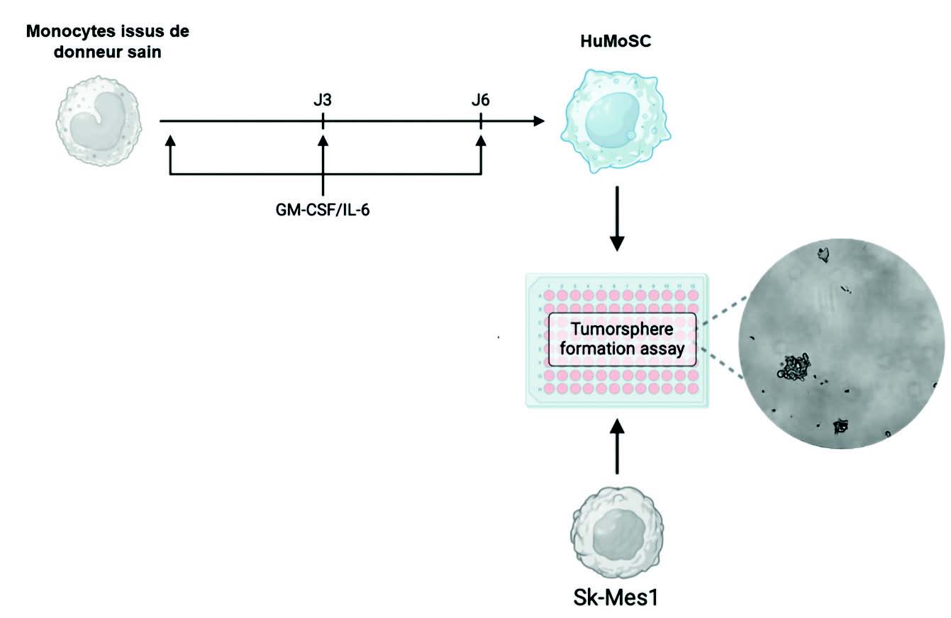 Figure 2 : Représentation schématique de la génération de HuMoSC (modèle in vitro MDSC). Après isolation des monocytes chez des donneurs sains et stimulation par IL-6 et GM-CSF, les HuMoSC sont mis en sphère en présence des Sk-Mes 1 (lignée de cancer du poumon). Crée à partir de Biorender.