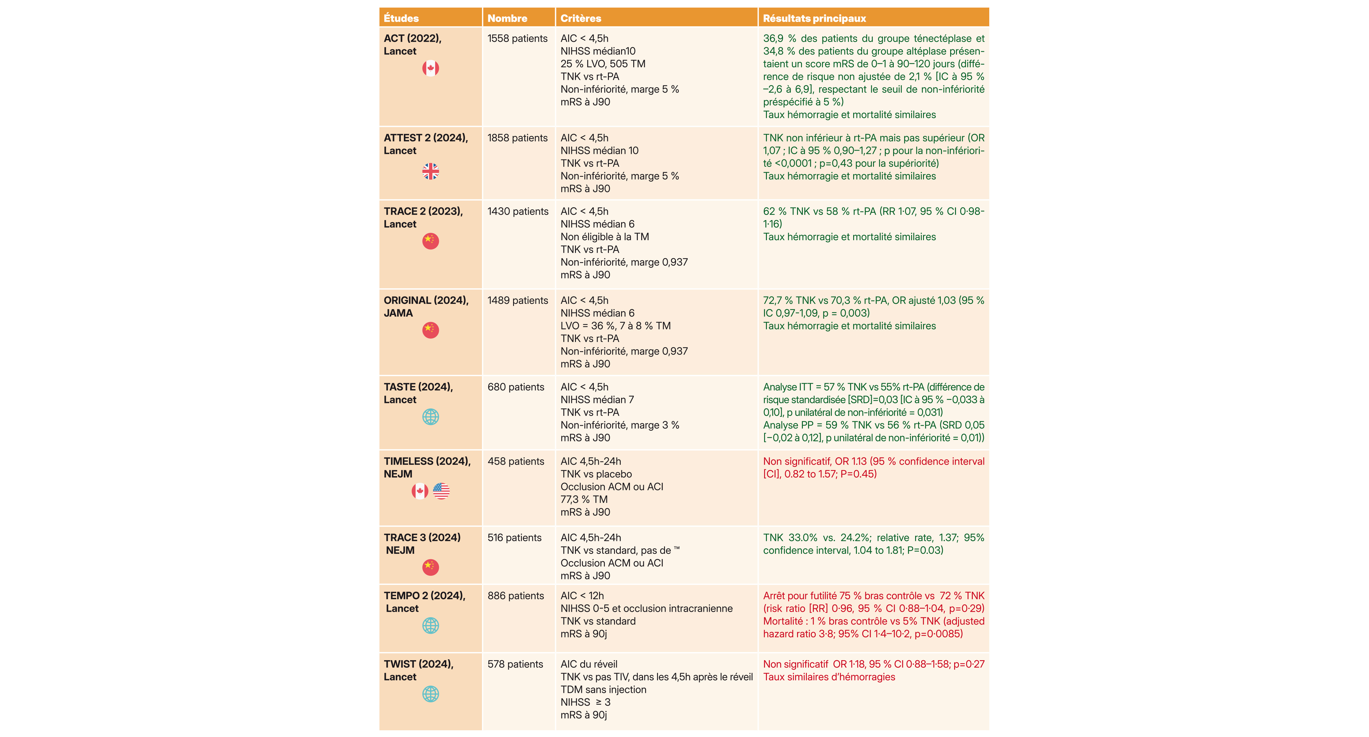 Pour les AVC ischémiques de moins de 4,5h du début des symptômes avec une occlusion d'un gros vaisseau : préférer Ténectéplase 0,25 mg/kg plutôt que l'alteplase, et ne pas retarder la thrombectomie mécanique.