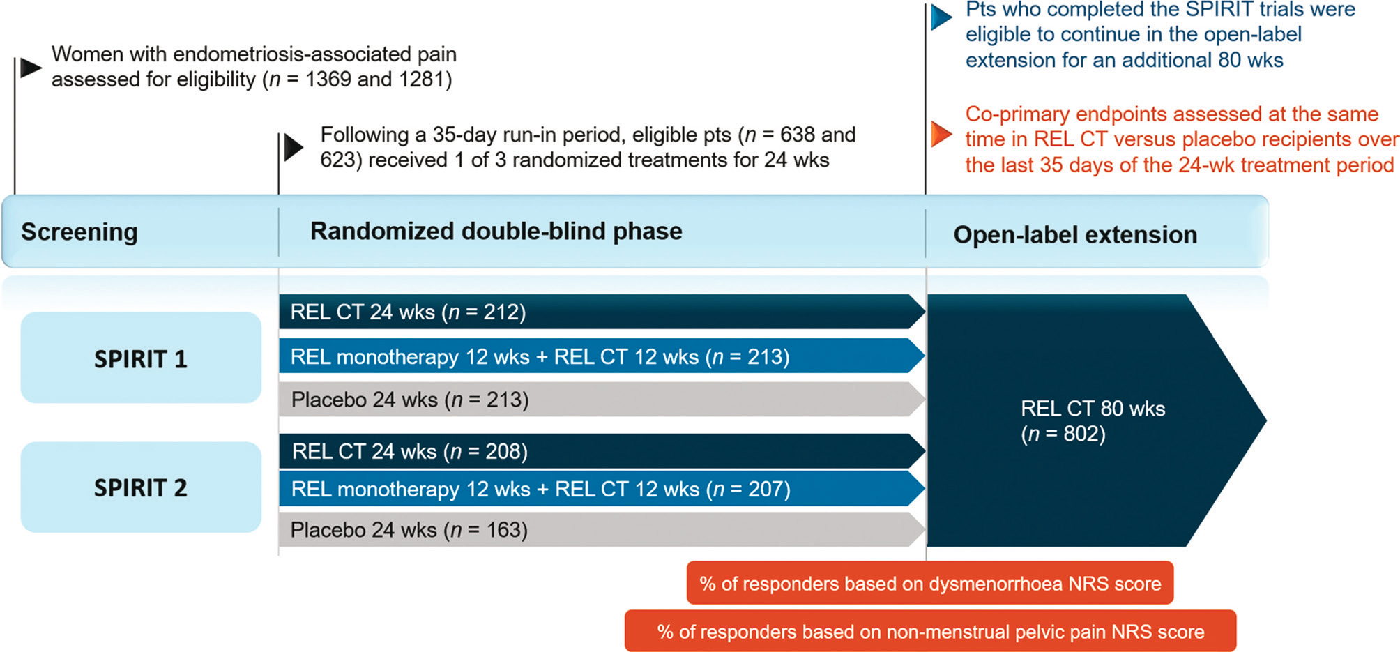 L'efficacité et la tolérance de la thérapie combinée au relugolix ont été évaluées au cours de deux essais cliniques de phase 3, multicentriques, randomisés et en double aveugle, menés sur les cinq continents de novembre 2017 à décembre 2019 (SPIRIT 1 et SPIRIT 2). Les patientes incluses étaient non ménopausées, âgées de 18 à 50 ans avec atteinte d'endométriose diagnostiquée par chirurgie ou non, avec ou sans analyse histologique, ou bien avaient eu un diagnostic histologique d'endométriose dans les dix années précédentes.