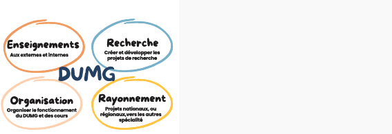 L'activité du DUMG est variée, elle s'articule autour de 4 pôles : enseignement, recherche, organisation et rayonnement ! Le pôle enseignement va se charger de proposer des cours pour les internes et les externes de la faculté : cours magistraux, conférences, ED ou encore organisation des ECOS… Concernant la recherche, on peut s'engager pour coordonner, créer et développer les projets de recherches sur différents thèmes : les inégalités sociales de santé, la thérapeutique, la santé mentale ; et sur l'organisation propre du DUMG :