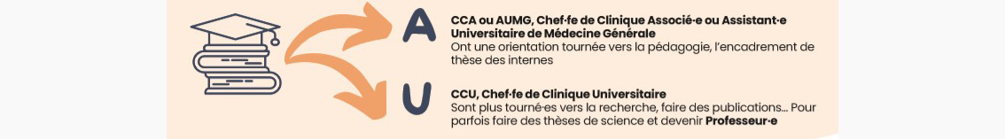 Globalement, il existe deux filières : la filière “A” pour associé et “U”, pour universitaire. La filière “A” vers l'enseignement de la Médecine Générale, et l'engagement territorial. La filière “U” sera plus tournée vers la recherche et l'engagement universitaire avec plus d'implication dans les projets de recherche d'ampleur (Appel à projets nationaux, thèse de science…) et la prise de responsabilité à la faculté avec comme summum un poste de PU (Professeure des Universités) !