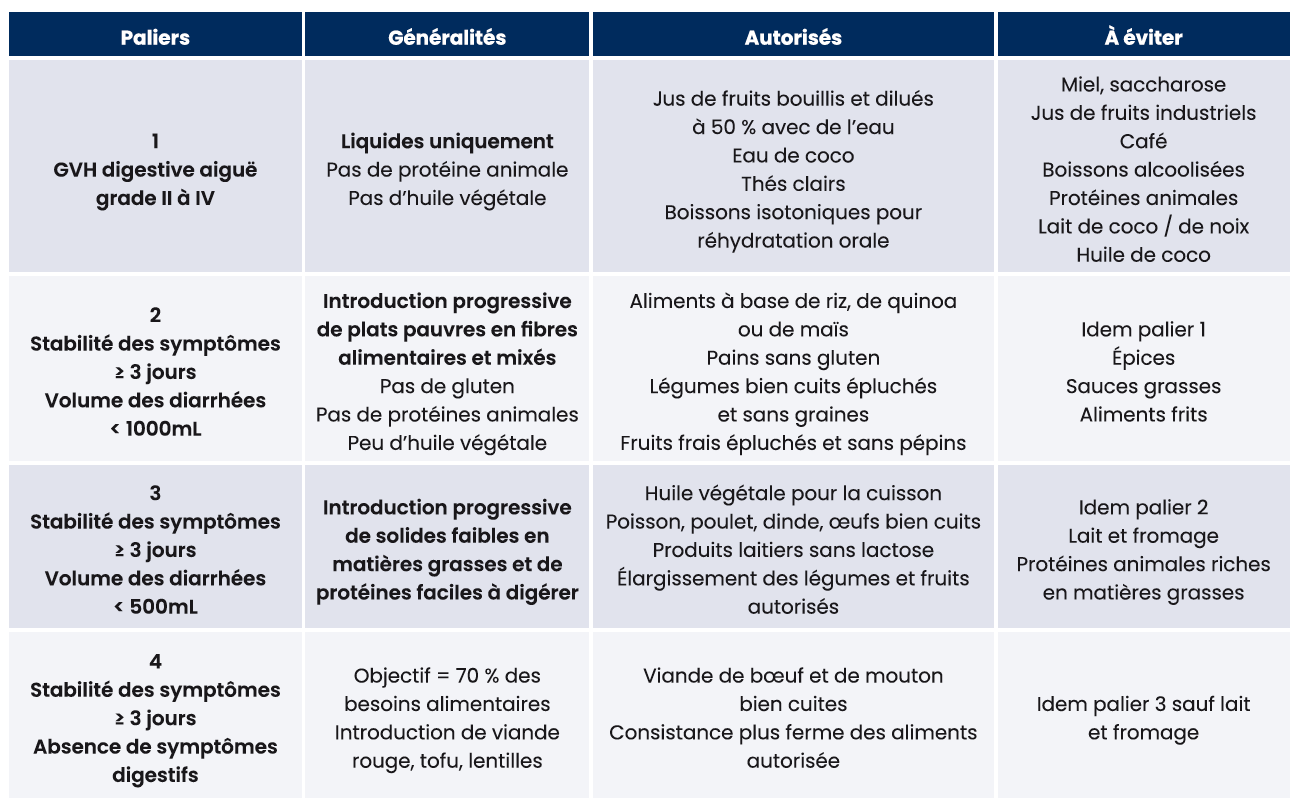La nutrition orale doit être adaptée, en limitant les glucides peu fermentants, les fibres, les lipides, la caféine et autres irritants intestinaux (dont le lactose qui favoriserait la survenue de GVHd23). La densité et la consistance des aliments doivent être progressivement augmentées en fonction de la tolérance digestive. Une stabilité des symptômes digestifs pendant au moins 3 jours permet le passage au palier supérieur (tableau 3)24