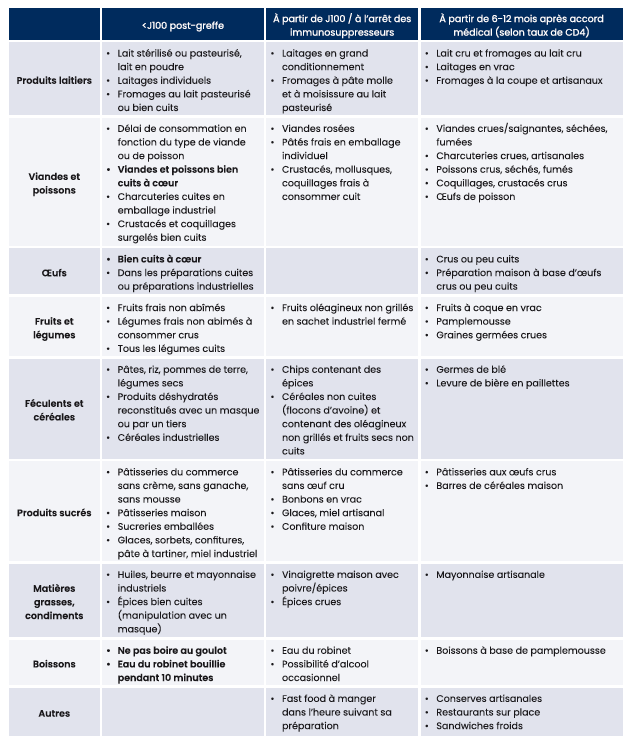 Les consignes alimentaires à la sortie d'hospitalisation doivent garantir un apport nutritionnel optimal, tout en satisfaisant le plaisir gustatif du patient et en limitant le risque infectieux. La SFGM-TC a ainsi proposé une harmonisation des recommandations alimentaires avec actualisation du carnet patient 18.