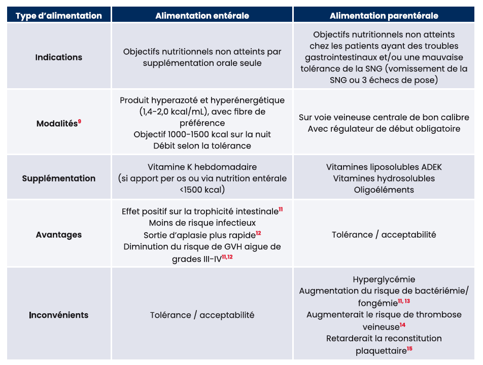 8. Baumgartner A, Schuetz P. Nutritional Support. In: Sureda A, Corbacioglu S, Greco R, Kröger N, Carreras E, éditeurs. The EBMT Handbook [Internet]. Cham: Springer International Publishing; 2024 [cité 16 déc 2024]. p. 211-7. Disponible sur : https://link.springer.com/10.1007/978-3-031-44080-9_25