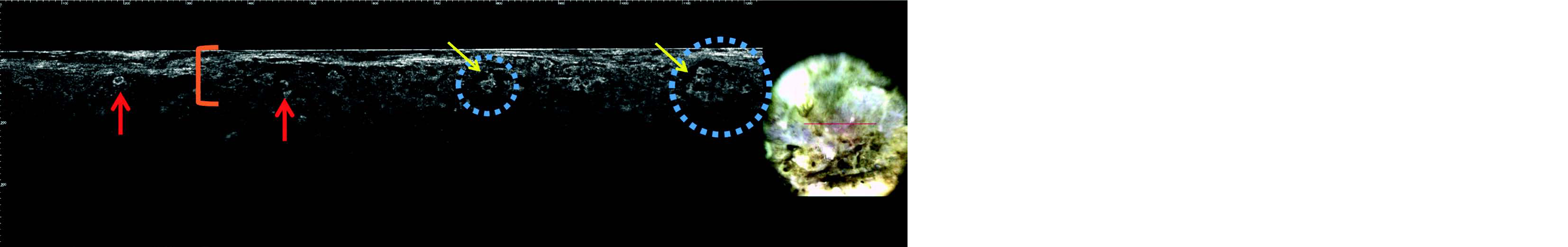 Figure 3 : Colocalisation LC-OCT et dermoscopie confirmant la destruction de la jonction dermo-épidermique (crochet orange), la présence de cellules atypiques isolées en ascension pagétoïde (flèches rouges), ainsi que des amas cellulaires ou thèques détruisant la jonction (cercle bleu), associés à un clefting (flèches jaunes).