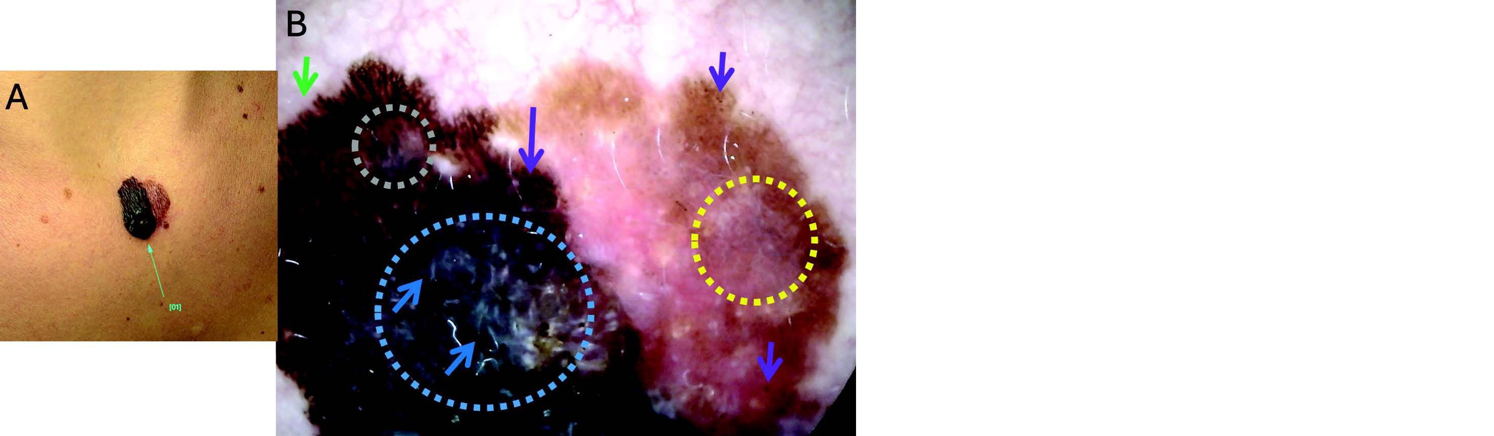 Figure 1A : Présentation clinique d'une lésion pigmentée atypique située au niveau dorsal, évoluant à partir d'un naevus dermique de type molluscoïde connu. Figure 1B : Dermoscopie polarisée (X20) révélant plusieurs motifs atypiques : pseudopodes (fl èches vertes), globules (cercle violet), réseau inversé (cercle jaune), voile bleu-blanc (cercle bleu), zone de régression (cercle gris) et chrysalides atypiques (fl èche bleue).