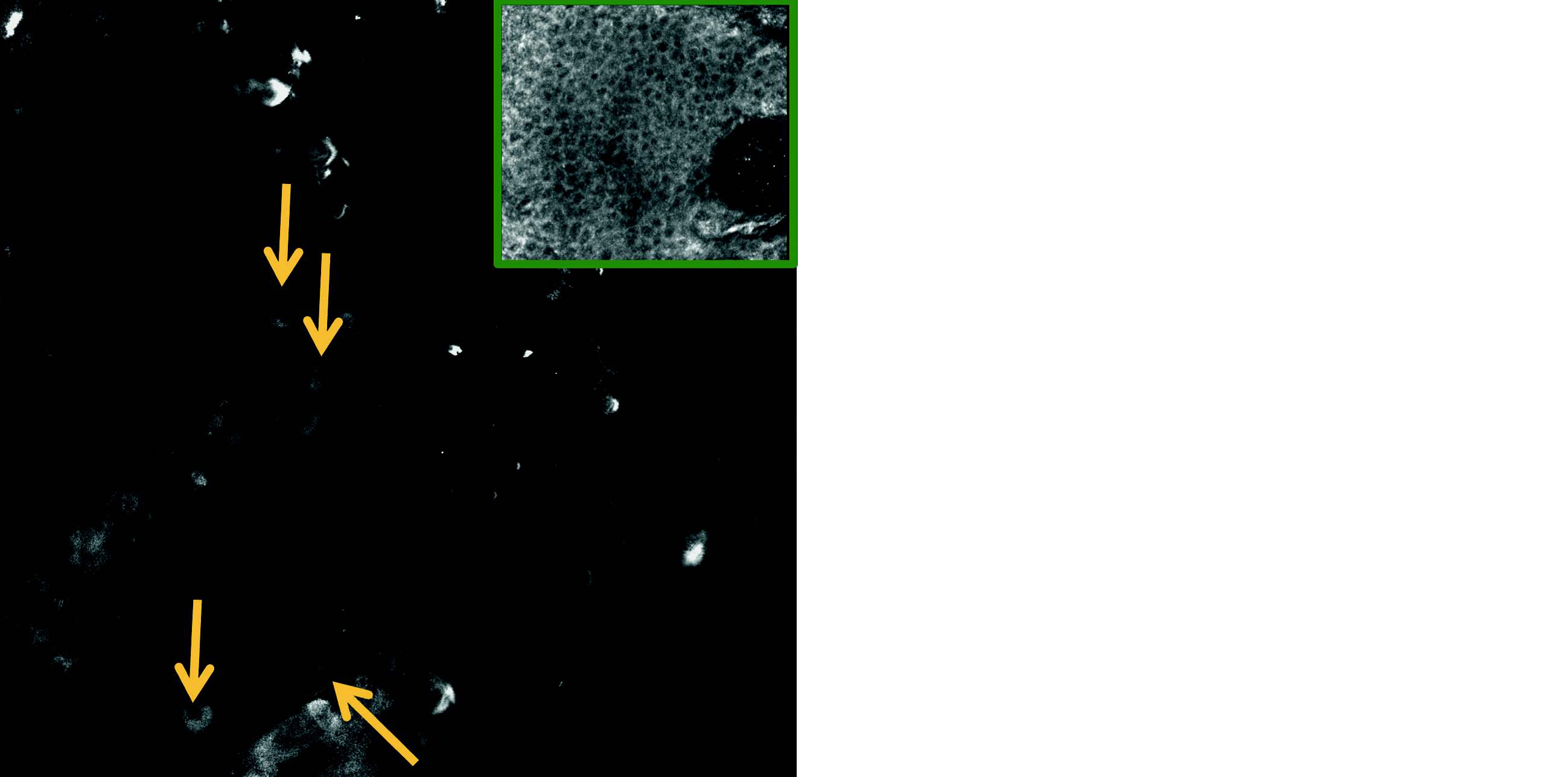 Figure 2 : Image en microscopie confocale montrant de volumineuses cellules rondes hyperréflectantes en ascension pagétoïde dans l'épiderme (fl èche orange). En comparaison, une image confocale normale de l'épiderme révèle un patron homogène en nid d'abeille (encadré vert).